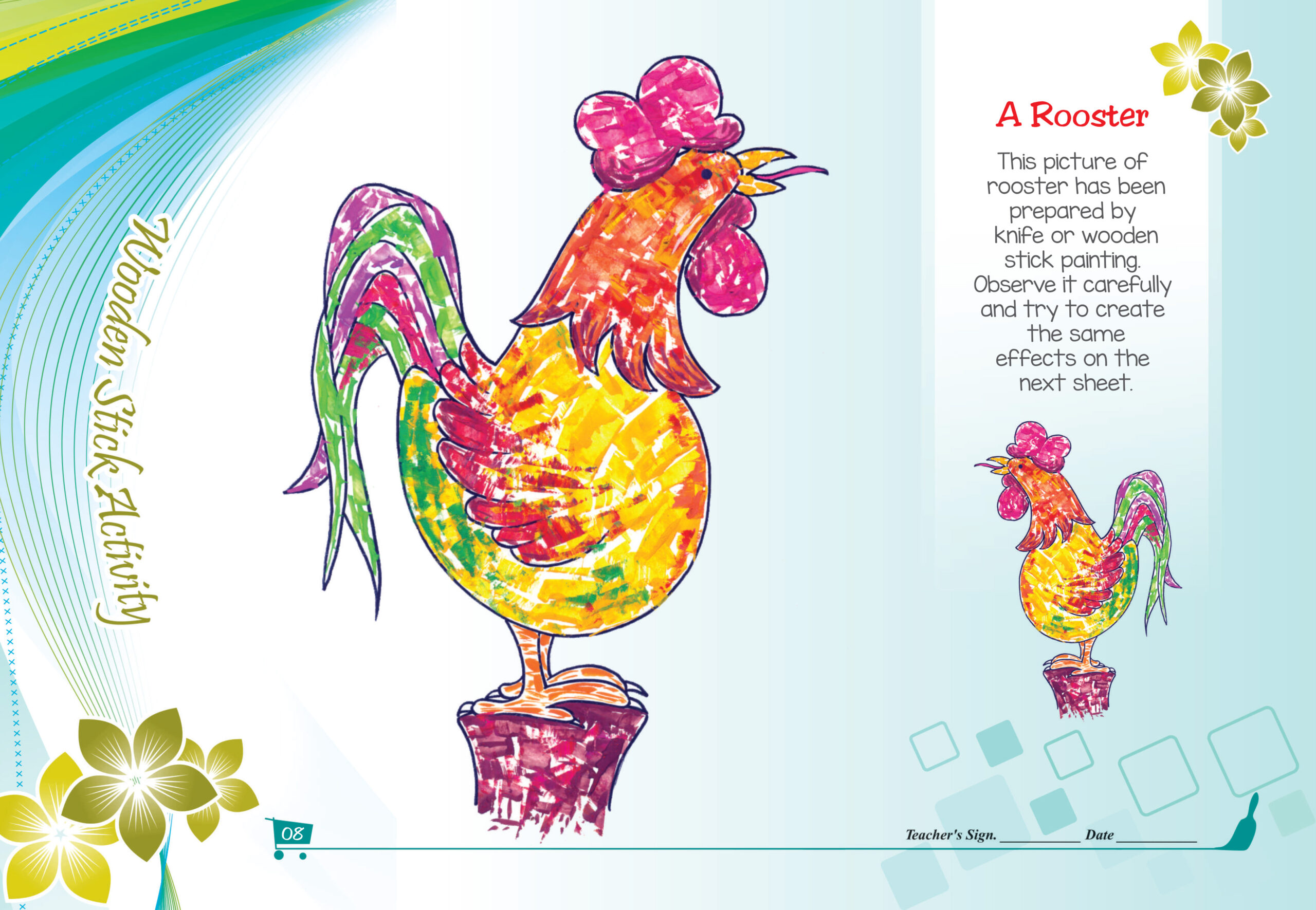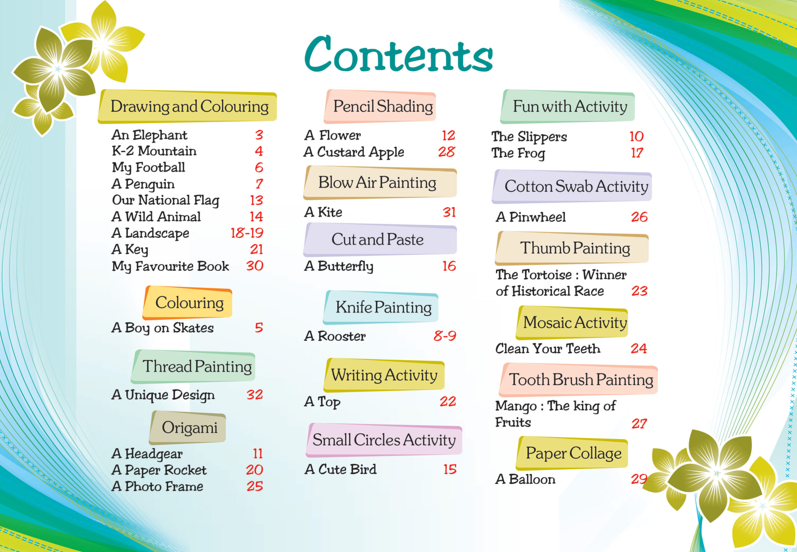 The series includes various activities of drawing, colouring, tracing painting, pencil shading, paper cutting, paper folding, paper craft, pasting objects, making impression, pattern making using different techniques like air blowing technique, etc.