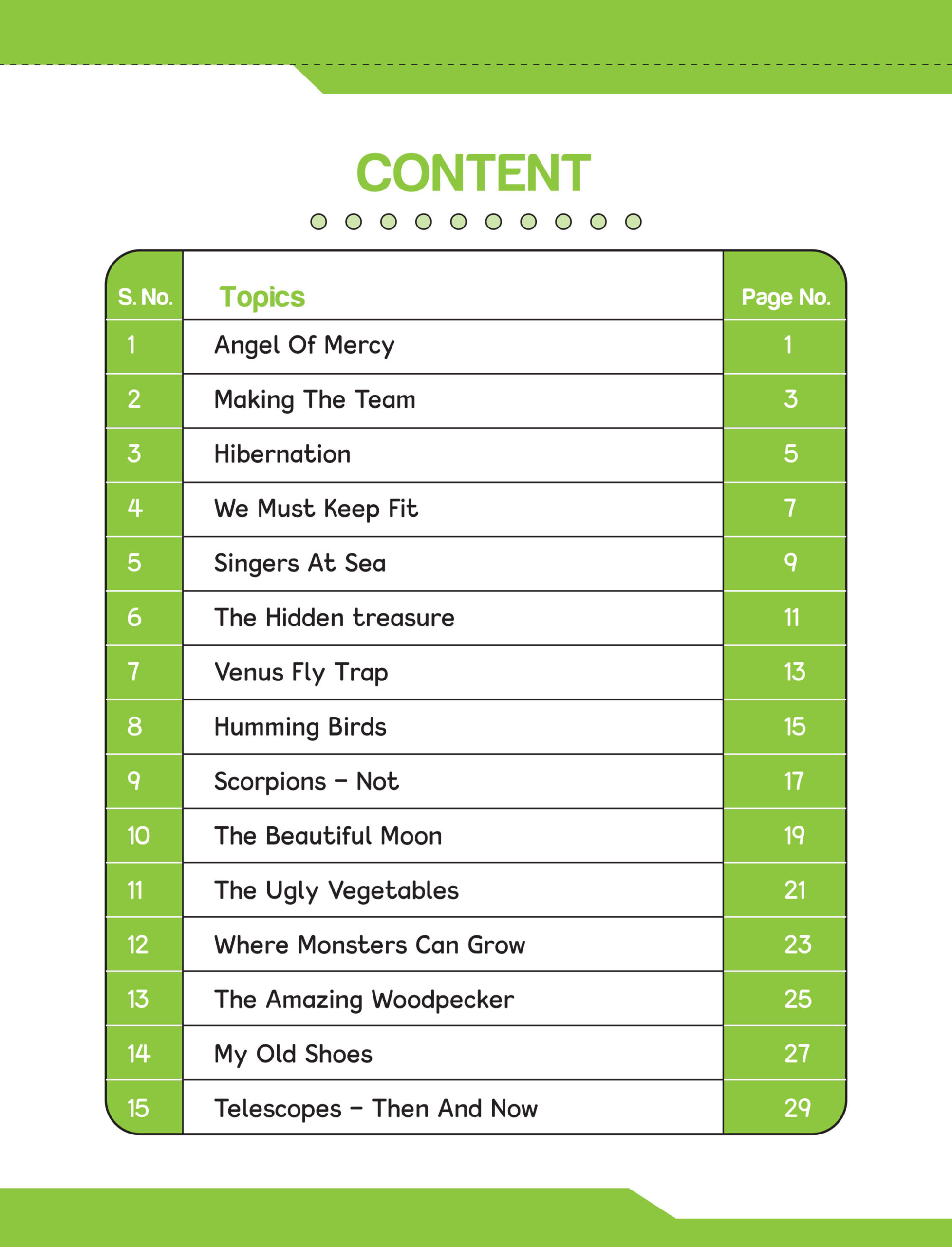 These five books have been divided into topics (chapters). Care has been taken to focus attention familiar to the child i.e. the home, the school, the park, neighborhood etc.